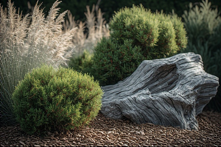 Ставка на структуру: Основу сада составляют хвойные и злаки. Мы выбираем сорта, которые генетически запрограммированы держать форму (карликовые сосны, подушковидные ели, вертикальные можжевельники). Им не нужна регулярная стрижка, чтобы выглядеть аккуратно — они сохраняют заданную геометрию десятилетиями.